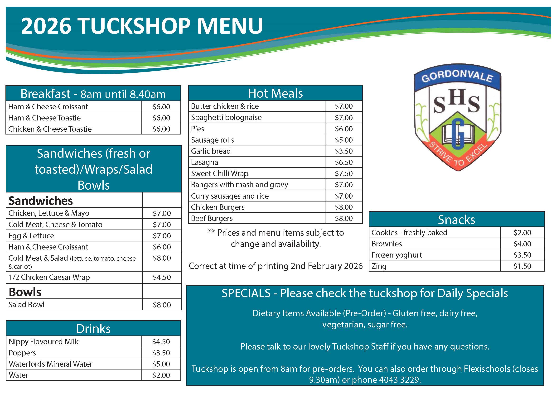 The Gordonvale State High School Tuckshop is run by our P&C together with volunteers from school families and the community. They are open everyday for our students to access and purchase a variety of lunch and snack options.